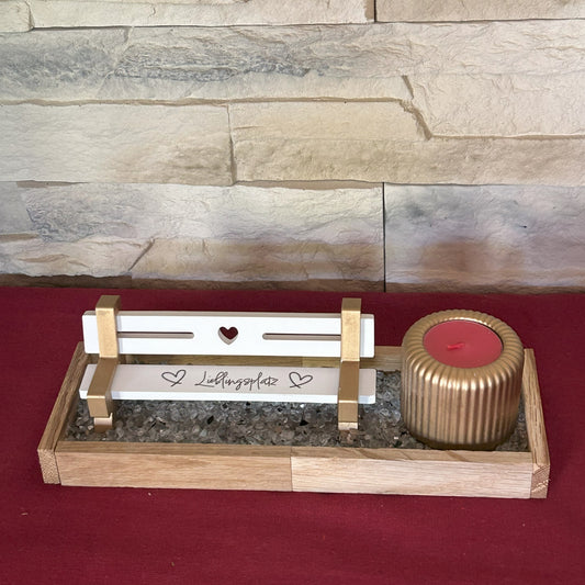 Deko Bank "Lieblingsplatz" mit Teelichthalter – Edles Design, Naturholz & Gold – Romantische Deko