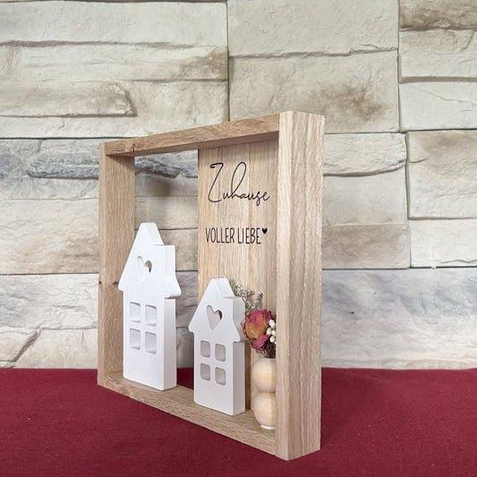 Dekorahmen „Hier wohnt das Glück“ mit 3D-Häuschen & Trockenblumen