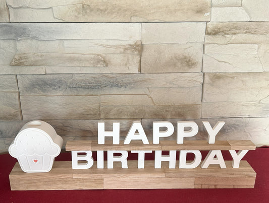 Geburtstagsdeko "HAPPY BIRTHDAY" – Deko Schriftzug mit Cupcake-Kerzenhalter