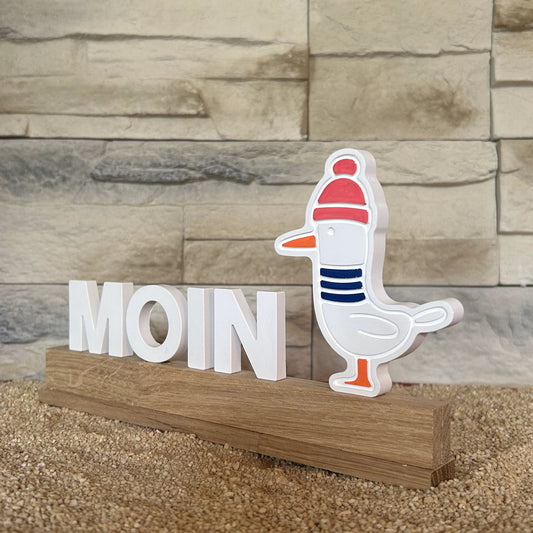 Deko-Schriftzug „Moin“ mit Möwe und Leuchtturm