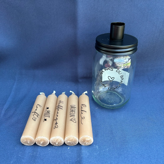 Kerzenglas mit Botschaft & 5 Spruchkerzen