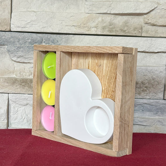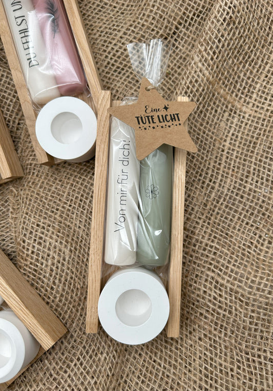 Kerzen-Set mit Kerzenständer, Holzbrettchen & Botschaft