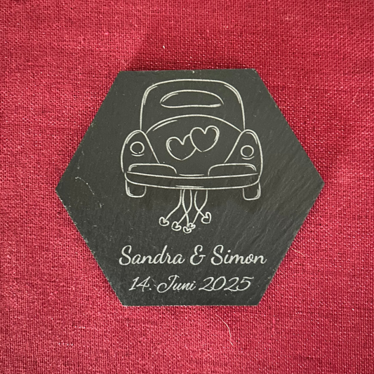 Schiefer Untersetzer Hochzeit „Just Married“ – personalisiert mit Namen & Datum