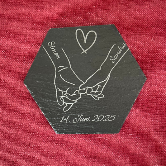 Personalisierter Schiefer Untersetzer „Hand in Hand“ – Gravur mit Namen & Datum