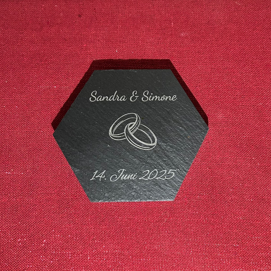 Schiefer Untersetzer Hochzeit „Eheringe“ – personalisiert mit Namen & Datum