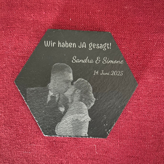 Personalisierter Schiefer Untersetzer „Wir haben JA gesagt!“ – Gravur mit Foto, Namen & Datum