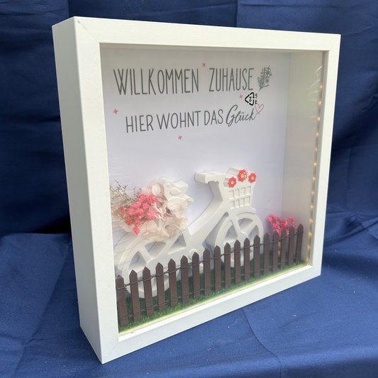 Dekorahmen „Willkommen Zuhause“ mit 3D-Fahrrad & Trockenblumen
