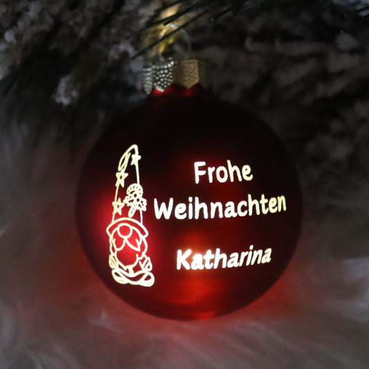 Personalisierte Weihnachtskugel mit Lasergravur Wichtel „Frohe Weihnachten + Name“