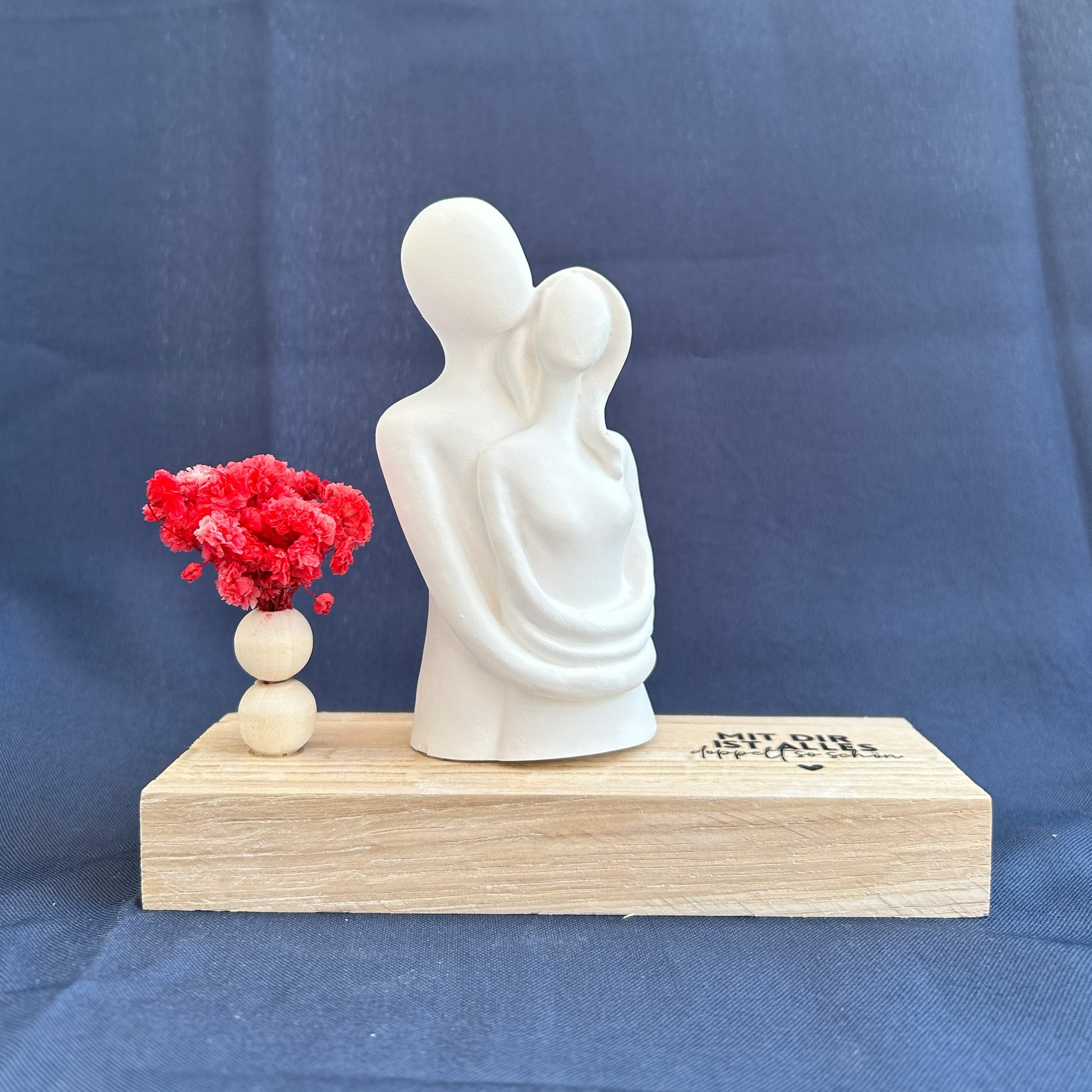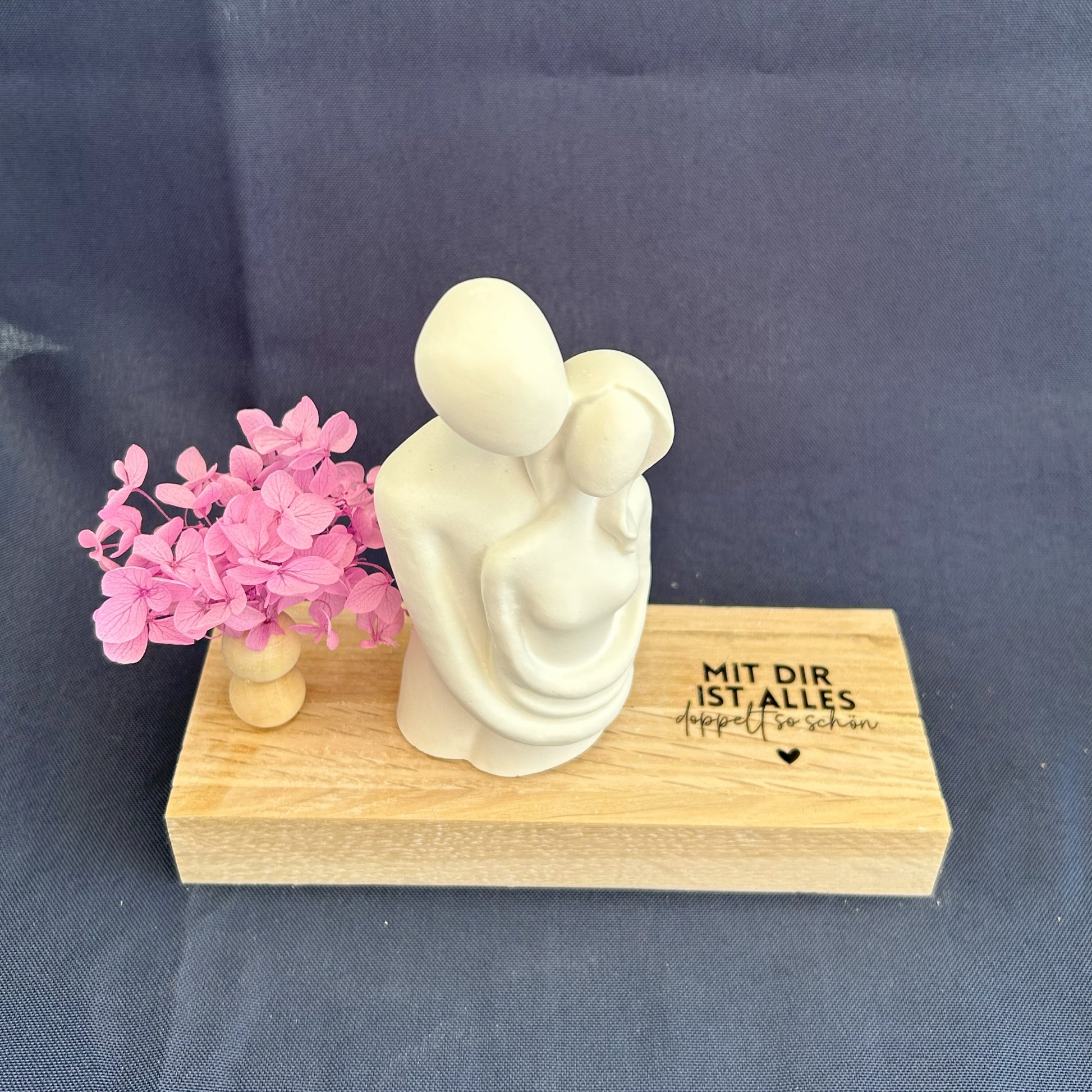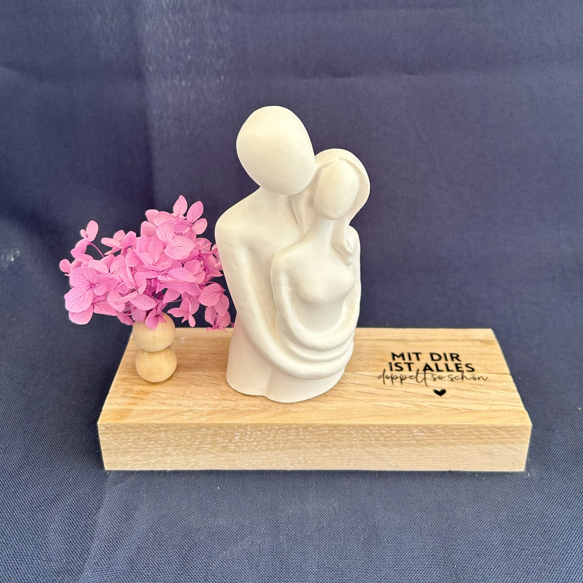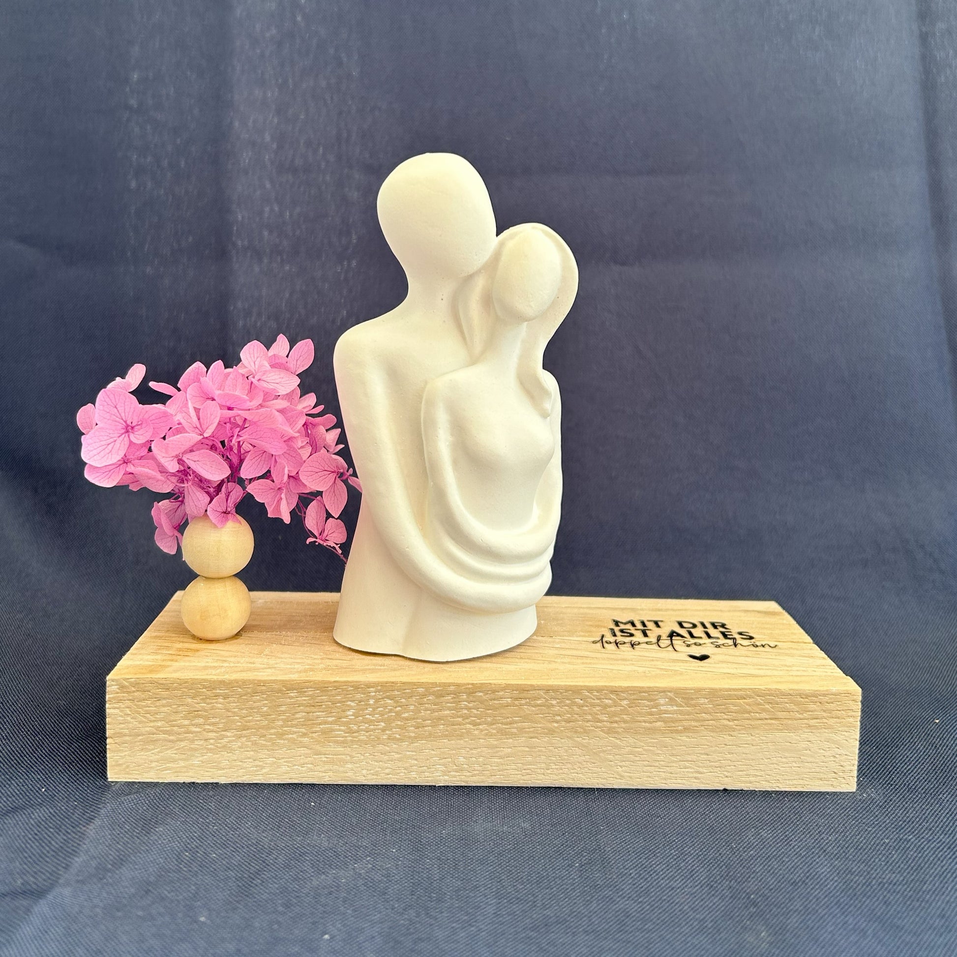 Diese stilvolle Dekofigur eines umarmenden Paares steht sinnbildlich für Nähe, Vertrauen und tiefe Verbundenheit. Die Gravur auf dem Holzsockel – „Mit dir ist alles doppelt so schön“ – macht dieses Arrangement zu einem herzerwärmenden Geschenk für den Partner, die Partnerin oder ein befreundetes Paar.