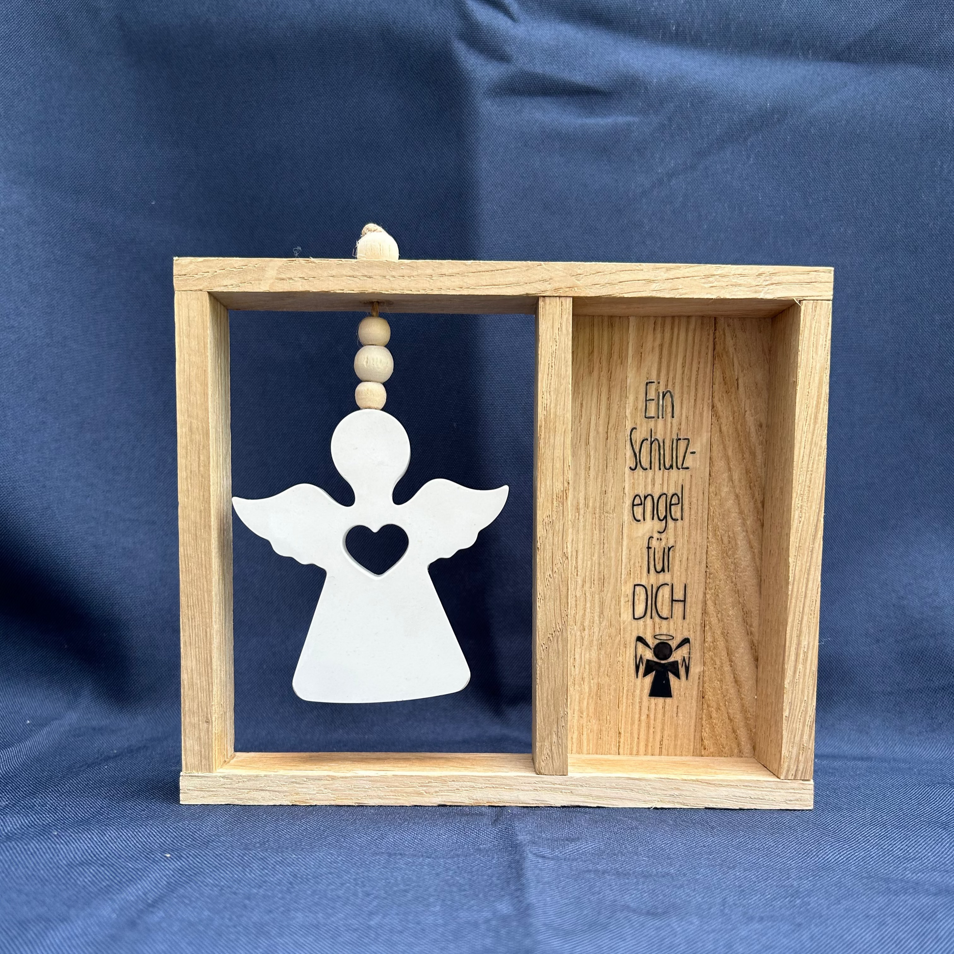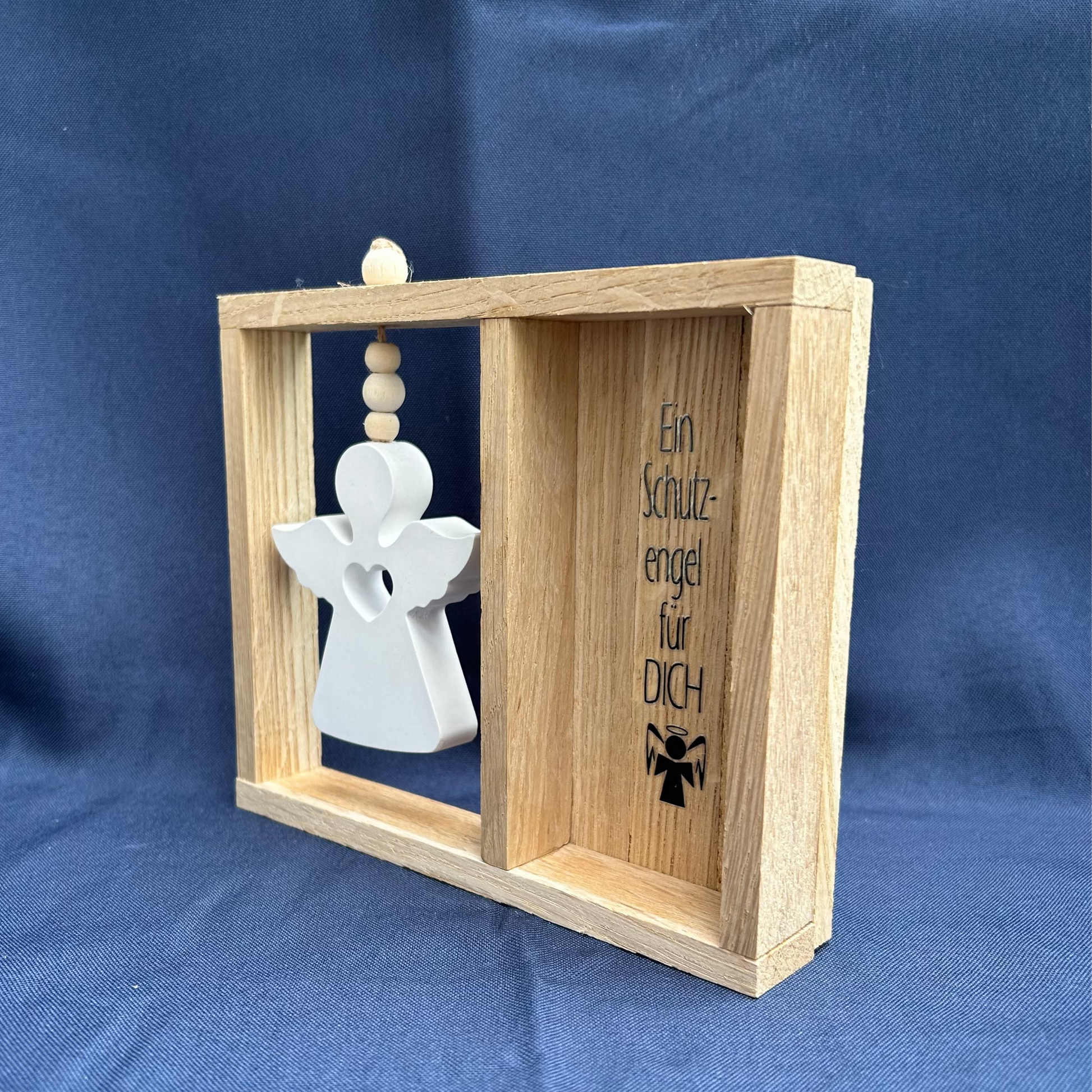 Der dekorative Holzrahmen mit hängendem Engel und der Gravur "Ein Schutzengel für Dich" ist ein symbolisches Geschenk, das Geborgenheit und Schutz vermittelt. Das stilvolle Design aus Naturholz und der weiße Engel mit Herzmotiv machen diesen Rahmen zu einem charmanten Deko-Element für Dein Zuhause.