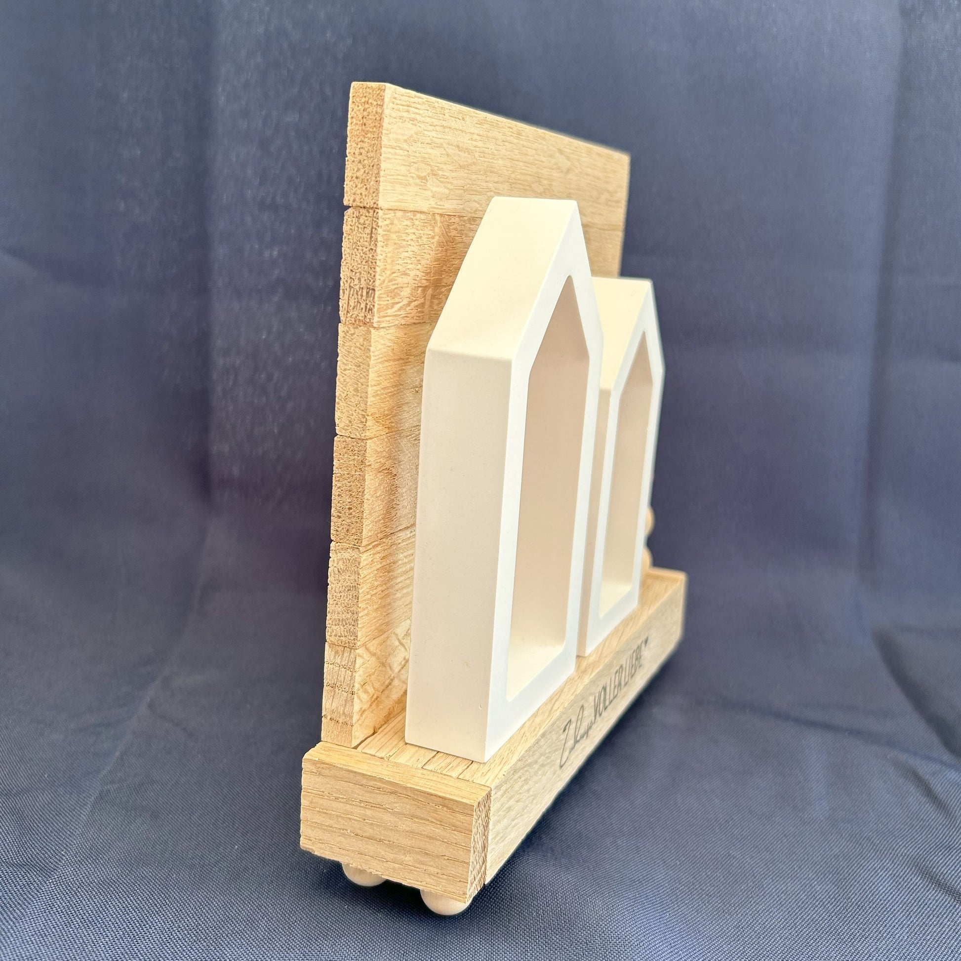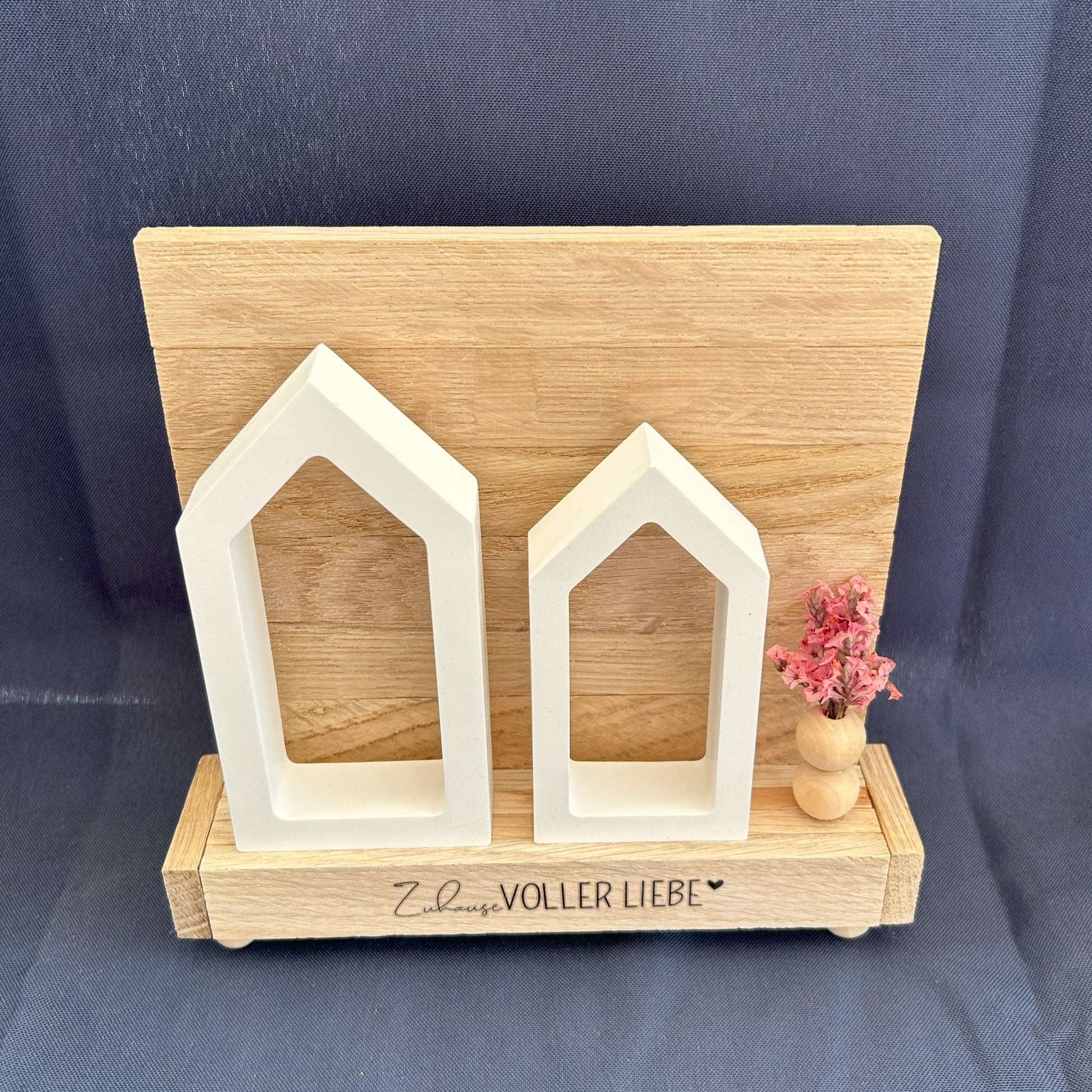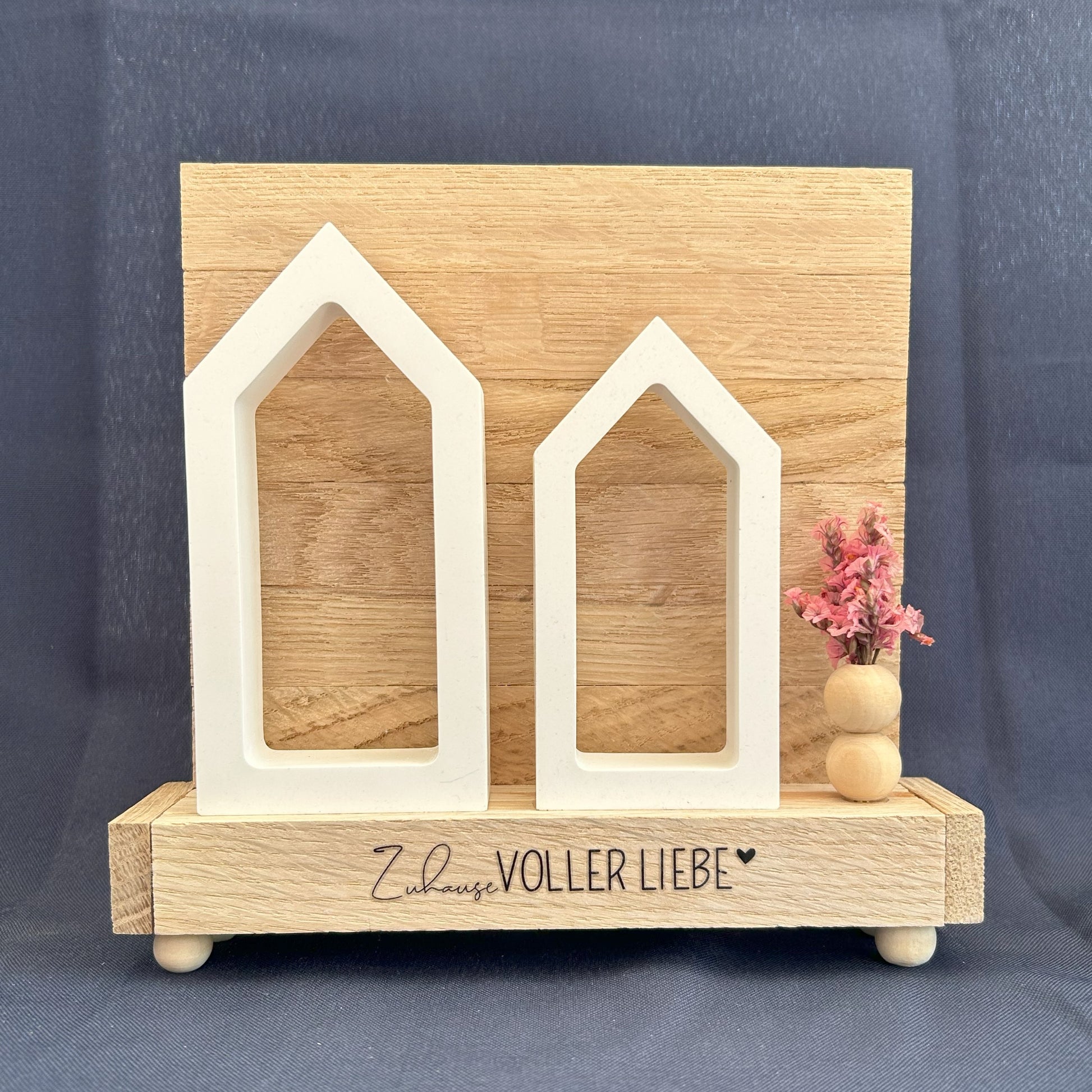 Zwei stilisierte Keramikhäuser in minimalistischem Design, zart arrangierte Trockenblumen in Holzvasen und ein naturbelassener Holzsockel mit Gravur machen diesen Artikel zu einer geschmackvollen Wohnidee – ideal zum Einzug, Muttertag, als Geschenk für Paare oder einfach für dich selbst.