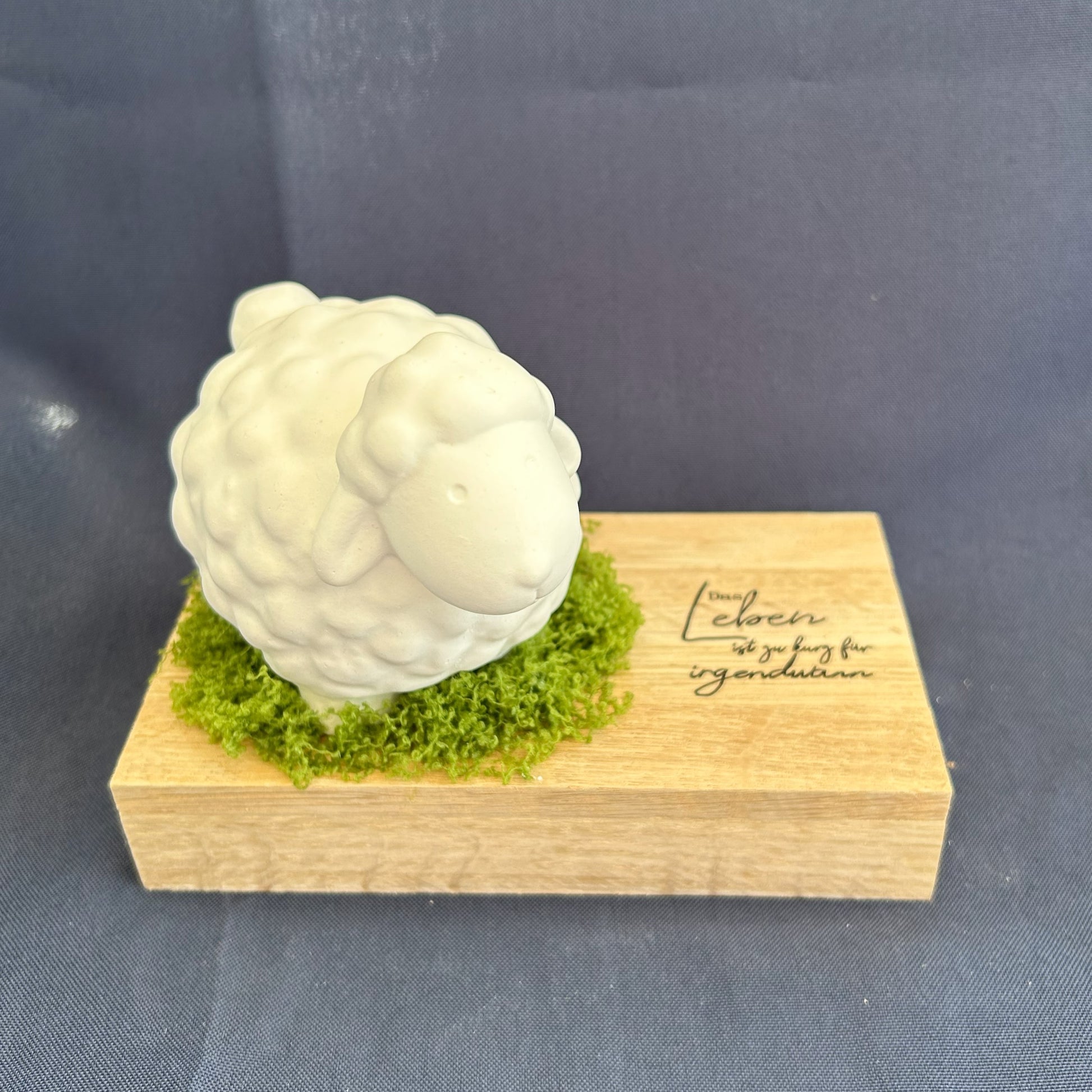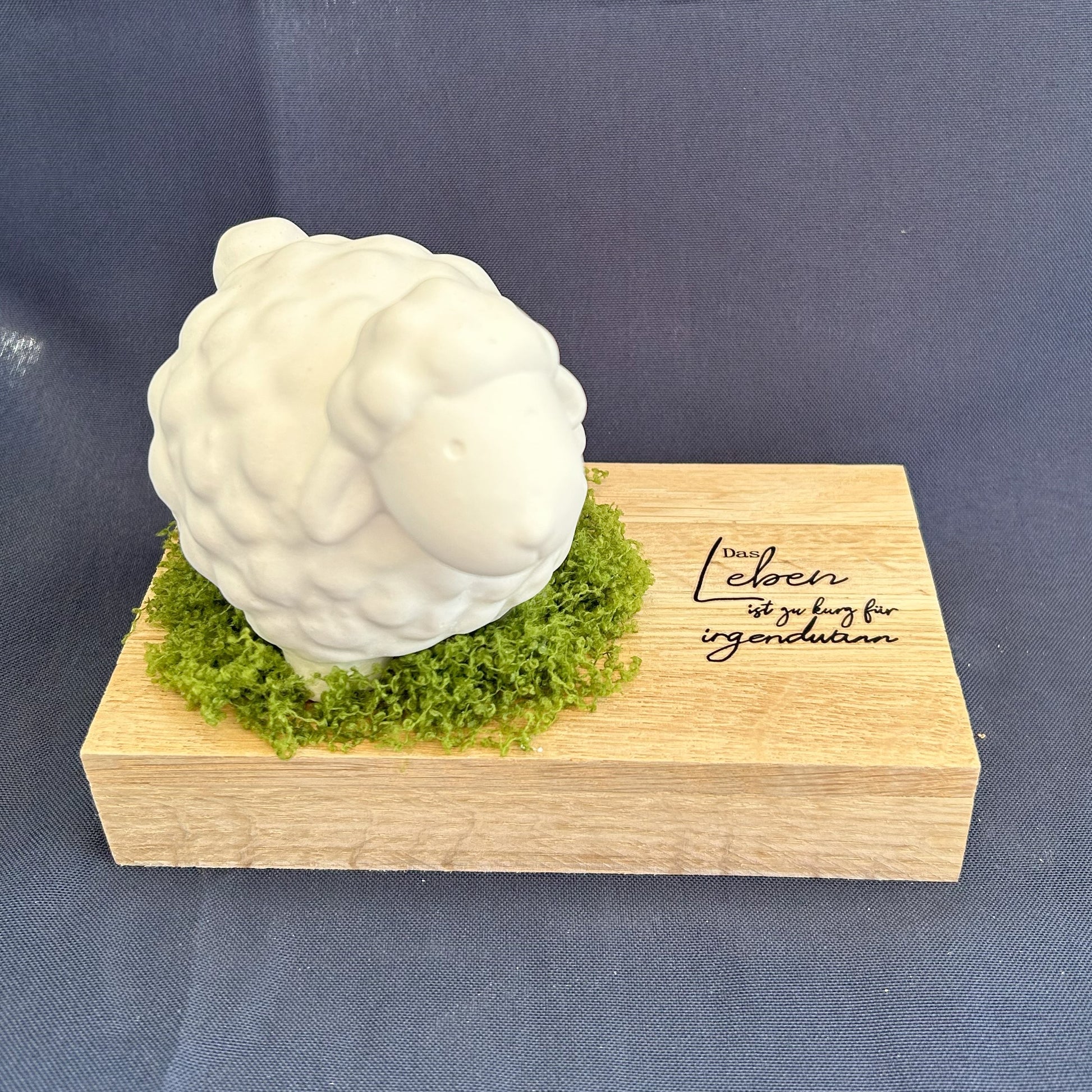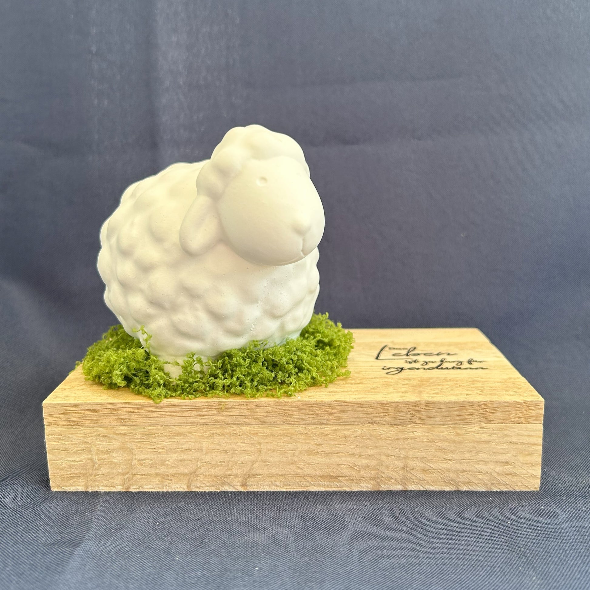 Das niedliche weiße Schaf sitzt gemütlich auf grünem Moos, platziert auf einem hochwertigen Holzsockel mit der Gravur: