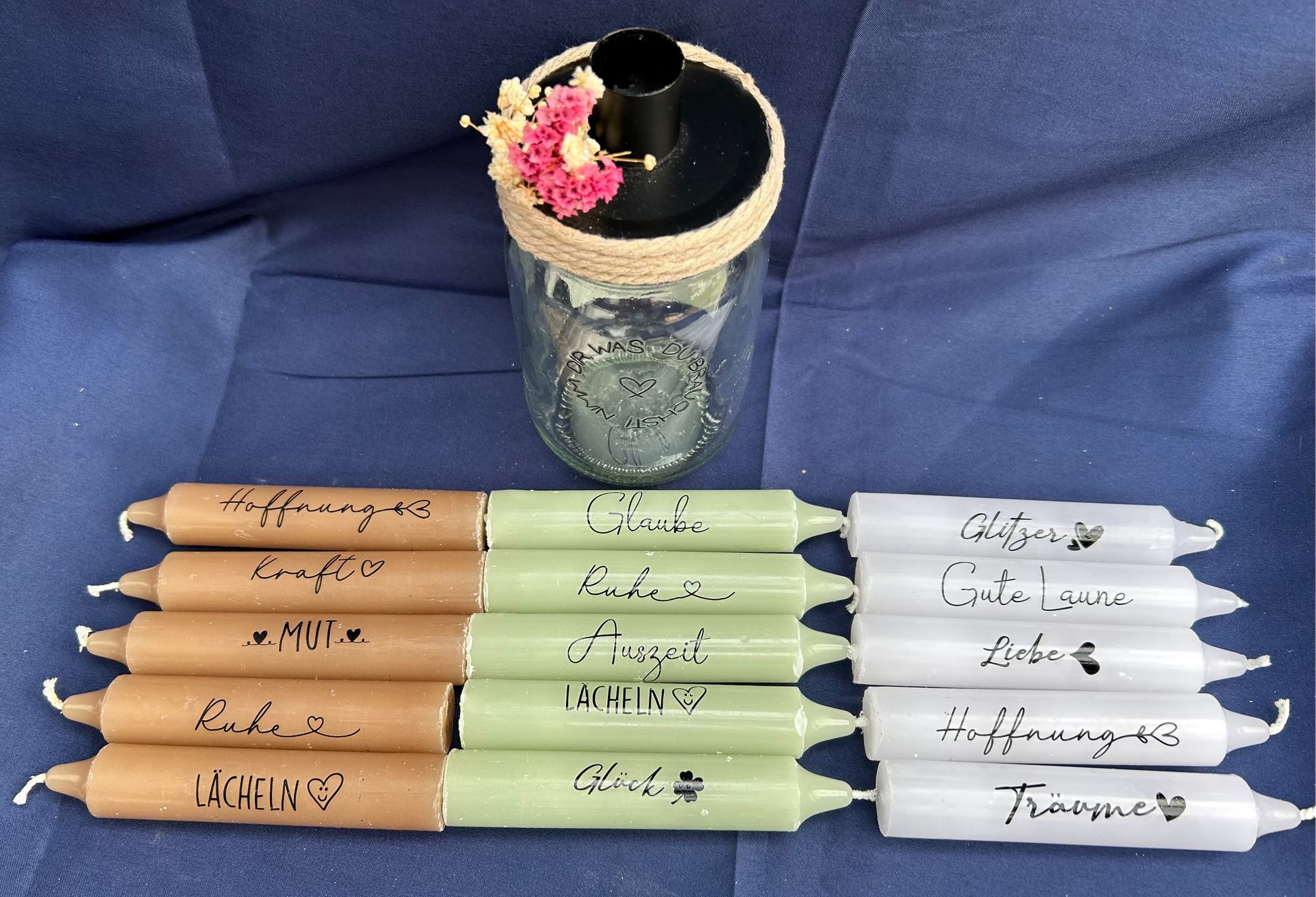 Kerzenglas mit Botschaft & 5 Spruchkerzen
