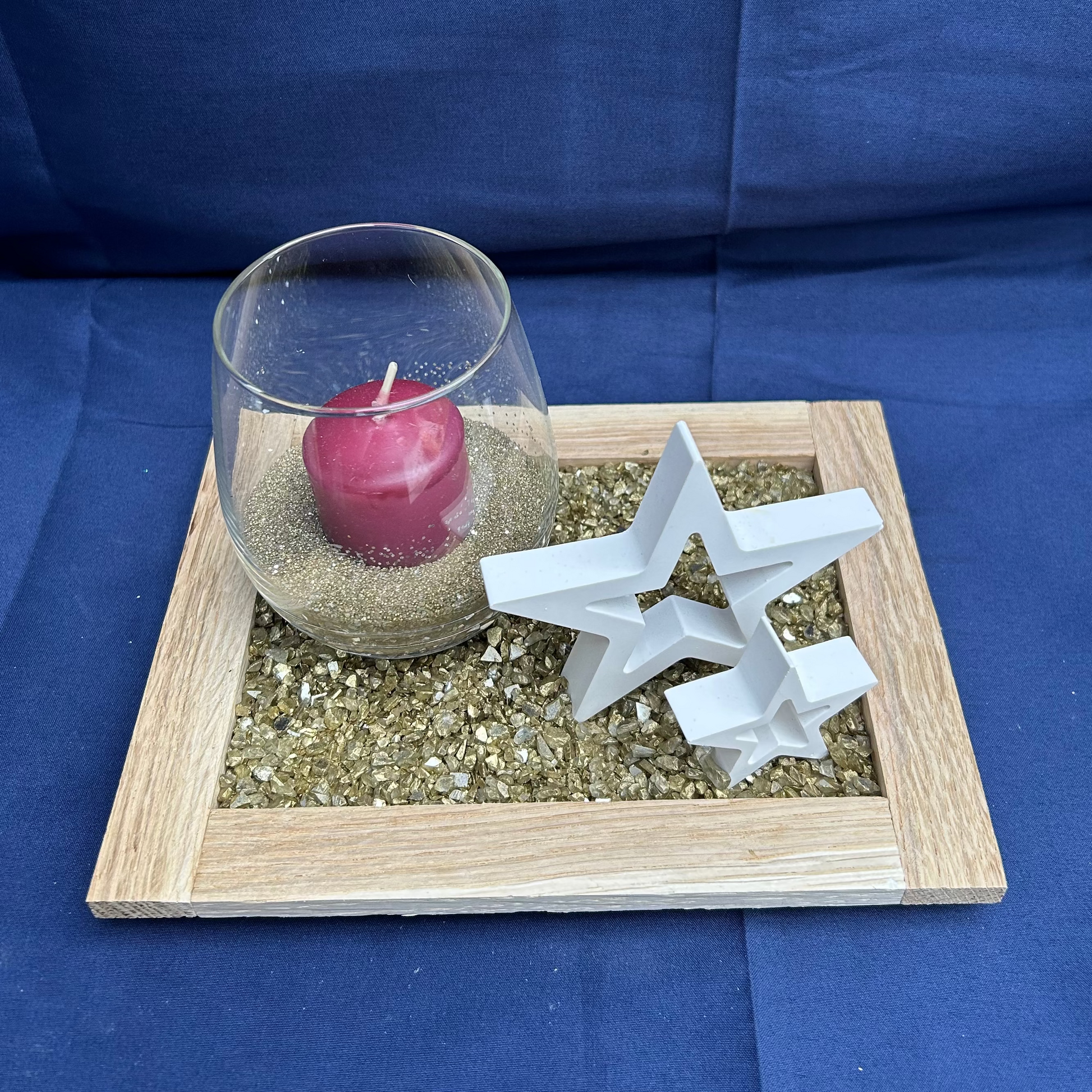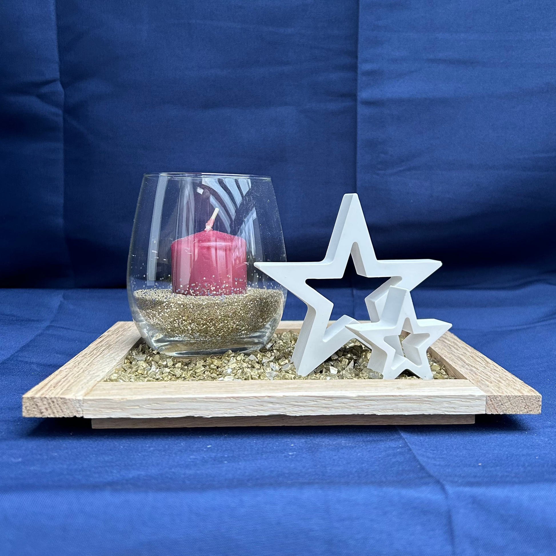 Auf einem quadratischen Holztablett harmonieren goldene Deko-Steine mit einem Windlichtglas samt roter Kerze und zwei weißen Sternen aus Gips. Ein stimmungsvoller Blickfang für die Weihnachtszeit – ideal für Tisch, Fensterbank oder als Geschenk.
